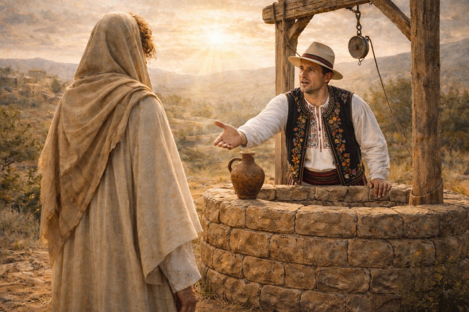 7. A venit o femeie din Samaria să scoată apă. “Dă-Mi să beau”, i-a zis Isus.